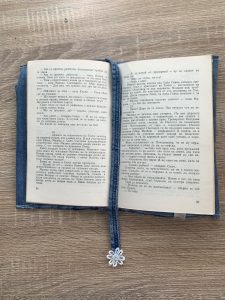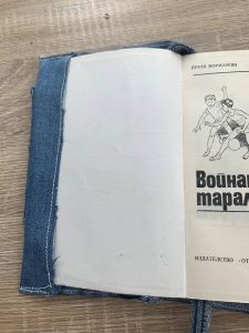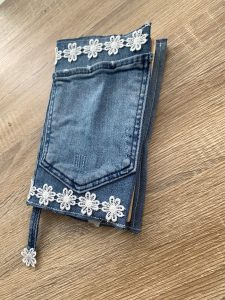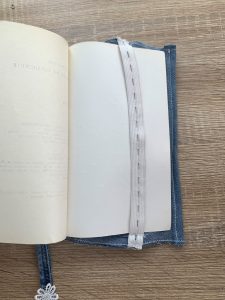 Последната идея,която споделям с вас е за изработването на подвързия за книга. Използвах широката част на крачола в частта около бедрото. Сложих шев от всички страни, за да не се разнищи. Всъщност искам да се разнищи, но само по ръбчетата. От едната страна е стандартно подгъната като подвързия, а от другата сложих широк ластик по средата, за да може подвързията да се ползва за различни по дебелина книга.