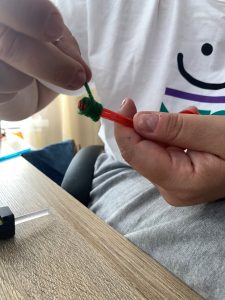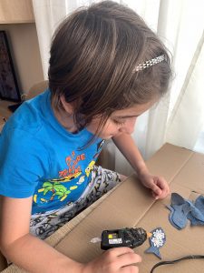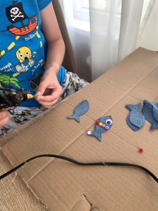 Това е! Рибките са готови. Остава само да се украсят, за да са шарени и интересни за детските очи. Щастлива съм, че си имам помощница, която се зае с тази задача. Дъщеря ми се включва винаги с интерес в моите проекти и е извор на много идеи. Вече може да работи със силиконовия пистолет и помага с удоволствие.