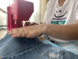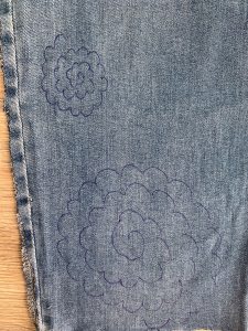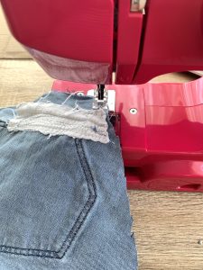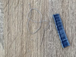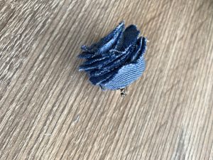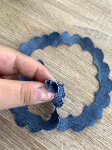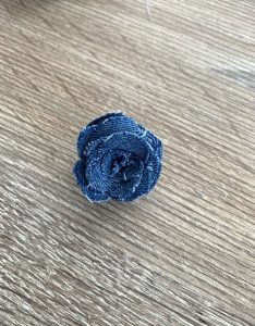 От останалата част от подгъва на дънките измерете необходимата обиколка от пръста си. Свържете двата края с игла и конец. Не се притеснявайте за естетичния вид на шева, защото на мястото на свързване на двата края ще поставим розичка. Ето как да я направите: