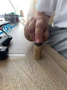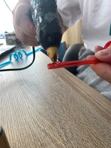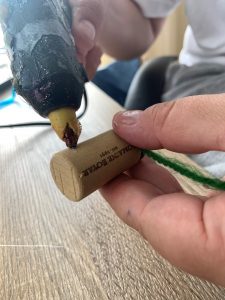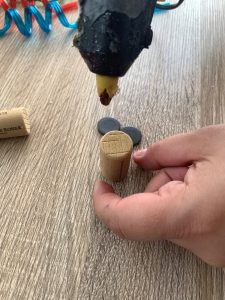 Първо залепете с помощта на силиконов пистолет магнитите за корковите тапи. В другия край на тапата залепете връвта. Залепете срещуположния край на връвта за сламката. Въдиците и рибките са готови.