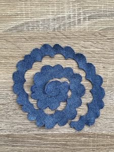 За пръстена ще ви е необходим по-малкият размер. Изрежете по контура на вълничките. Направете малка фунийка като започнете от центъра на изрязаната форма. Постепенно навивайте останалата част около фунийката. Залепете със силикон крайчето на розичката.Ако нямате силиконов пистолет можете да зашиете с игла и конец. Залепете я или я пришийте към пръстена. Красив е нали!