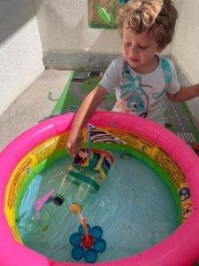 Със сина ми изпробвахме корабчетата на малък надуваем басейн на терасата. Много му хареса и дълго време не можа да се откъсне от играта. Използвахме и няколко фигурки на различни животни, които поплаваха с шарените лодки и корабчета.