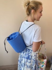 Ето и още едно предложение. Този път за раничка за плажа, а и не само, направена от пластмасова туба за вода. Необходими са ви парче плат,  връзка и рингче за затварянето и въженца за презрамки.