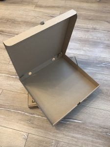 Сгънете капака на кутията нагоре така че да получите отпред 7-8 см място за поставяне на материали. Поставете картон в задната част, за да се получи наклон. Залепете със силикон.