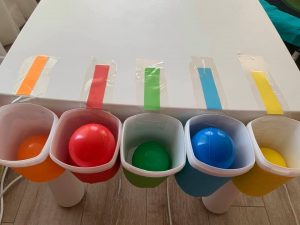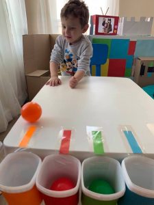 Бонус идея: Можете да използвате пластмасовите кутии от кисело/цедено мляко или други подходящи и да направите забавна игра за детето. Залепете кутиите за ръба на масата и ги означете с различни цветове. Детето трябва да вкара топка със съответния цвят в съответната кутия като застане на срещуположния на масата. Играта развива координацията ръка-око и е много забавна.
