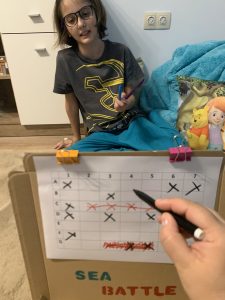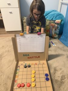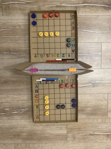 Необходими са ви 2 кутии от пица, 22 бр. пластмасови капачки, 2 щипки, няколко бели листа и флумастери. Във вътрешната страна на кутиите начертайте полетата за играта. Напишете цифрите от 1 до 7 и буквите от A до G.