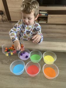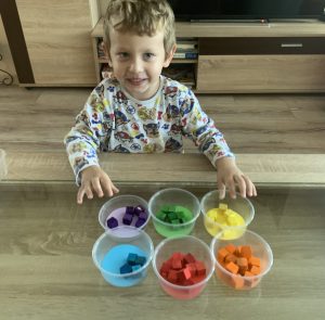 Децата обичат да сортират предмети по цвят, форма и други отличителни белези. Направих игра за сина ми от пластмасови кутийки и цветни дървени кубчета. В кутийките поставих картончета с цветове като на кубчетата и играта започна.
