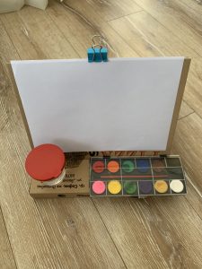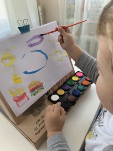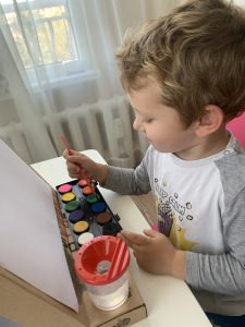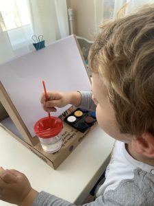Закачете бял лист или картон към статива с щипка и пригответе боички, четка и чаша вода. Моят син много обича да рисува и се залепи веднага за този импровизиран статив. Използваме го всеки ден и е много успешно рециклирано творение.
