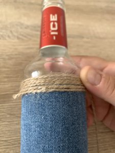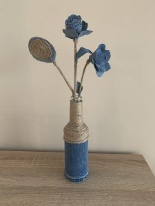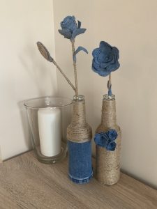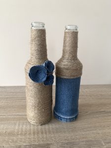 Този път бонус идеята ми е за повторното използване на стъклените бутилки. От тях изработих тези страхотни вазички. Ако искате по-голям размер можете да използвате бутилка от вино, например. Аз използвах въженце от сизал, дънков плат от старите дънки и силикон, за да залепя всичко. Можете да видите как се изработват розичките от дънков плат в моя предишна статия в блога на Място България. Там ще откриете и шаблон. Така ще можете да си изработите цветята от снимките. Изработих ги специално за целта, за да ви дамонстрирам вазичките. Нямах истински цветя, а не харесвам изкуствените и така докато получа истински, които да поставя вътре ще се наслаждавам на тези, които си изработих.