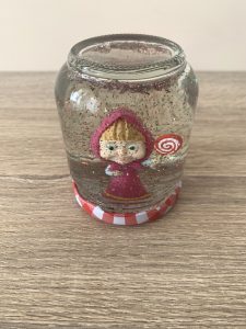 Необходими са ви бурканче, фигурка на любим герой, глицерин и брокат в различни цветове. Залепете, с помощта на силиконов пистолет, фигурката за капака на бурканчето. Напълнете буркана с вода, сипете малко глицерин и брокат и затворете. Преспапието е готово и съм сигурна, че детето много ще му се зарадва.