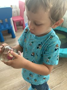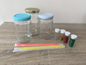 Поставете в буркана най-различни малки предмети- топче, копче, количка, фигурки на животни и други. Покрийте ги с ориз, дребен боб, стиропор, малки топченца, цветни хартийки или друго, с което разполагате вкъщи. Аз използвах, оцветен с боя за храна, ориз. Направете си списък с малките предмети, за да насочвате детето какво търсим когато разклащаме буркана и да го увлечете в играта.