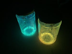 Можете да накарате бурканите да светнат като изсипете вътре съдържанието на една светеща гривна. Можете да добавите и малко брокат за повече блясък. Вярно, че светлината трае само няколко часа, но децата много ще харесат светещите буркани. Хубавото е, че можете да ги използвате отново и отново и винаги ще светят както първия път. Можете да ги използвате за пижамено парти, например. Или за парти на двора…
