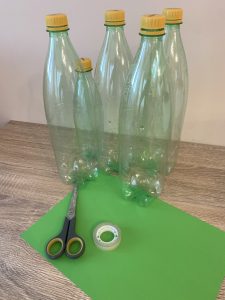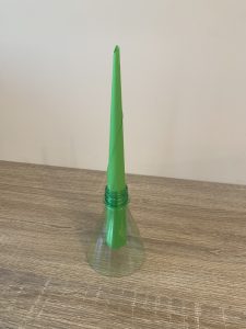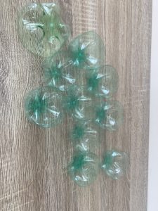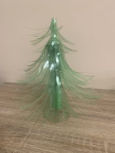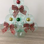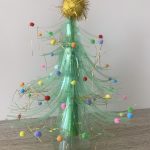 Използвайте едно от дъната на големите бутилки за основа. Залепете дъната на 10 бр. бутилки едно за друго във формата на елхичка. Можете да ги щракнете и с телбод, защото силиконът стопява пластмасата на бутилката. Пробийте дупка в дъното и завържете коледна топка. Можете да украсите елхата с панделки, камбанки и други.