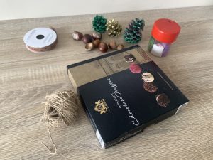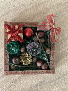 За центъра на масата реших да изработя този мотив от кутия за бонбони, много естествени материали- шишарки, клечки, жълъди, кестени и други. Увих кутията с въженце от сизал .Отгоре поставих коледна, ленена лентичка с надпис и подредих вътре всичко, с което разполагах. Посипах с бял брокат. Получи се много добре и мисля, че масата ще изглежда чудесно с него.