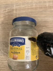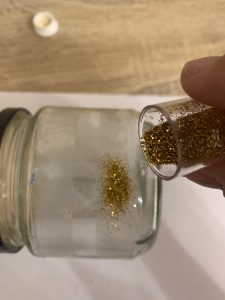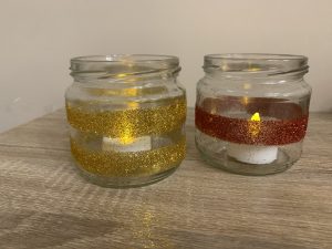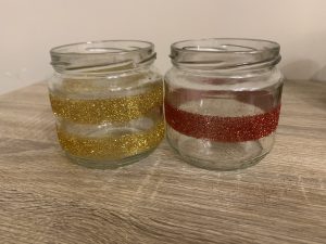 Бурканите също могат да се превърнат в страхотни свещници. Необходими са ви буркани, в които може да се сложи чаена свещ, двойнозалепваща лента и брокат. Залепете лентата за буркана и посипете брокат. Избрах златен и червен брокат, защото това ще са основните цветове на моята трапеза. Можете да изберете и сребърно, лилаво, зелено или друг цвят, който ви носи коледно настроение