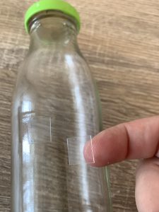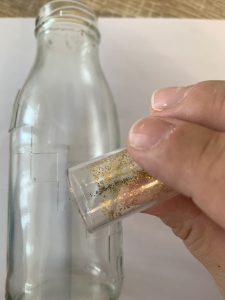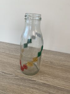 Отлепете етикетите на бутилката. Залепете двойнозалепващи стикери като образувате форма или ги поставете хаотично върху бутилката. Посипете с брокат и вазата ви е готова.