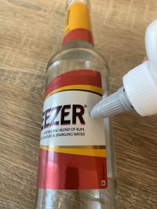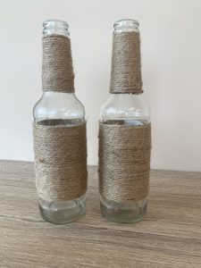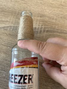 Намажете етикетите на бутилката, обилно, с лепило. Залепете края на въженце от сизал и го увивайте около шишето докато покриете желаната повърхност.