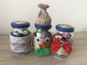 Коледа е очакван празник най-вече за децата, които нямат търпение да разопаковат подаръците и да похапват вкусотии по цял ден. Реших, че ще бъде страхотно да използвам непотребните стъклени бурканчета, за да поставя вътре вкусни шоколадчета и бонбони за децата. Украсих ги, за да са весели и забавни и да носят празнично настроение.